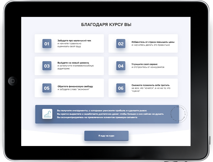 + Как продавать свои услуги дорого? + Признаки высокооплачиваемого специалиста + Психология работы с клиентом + Как показать результат? + Как себя продавать? +Ценообразование + Делегирование